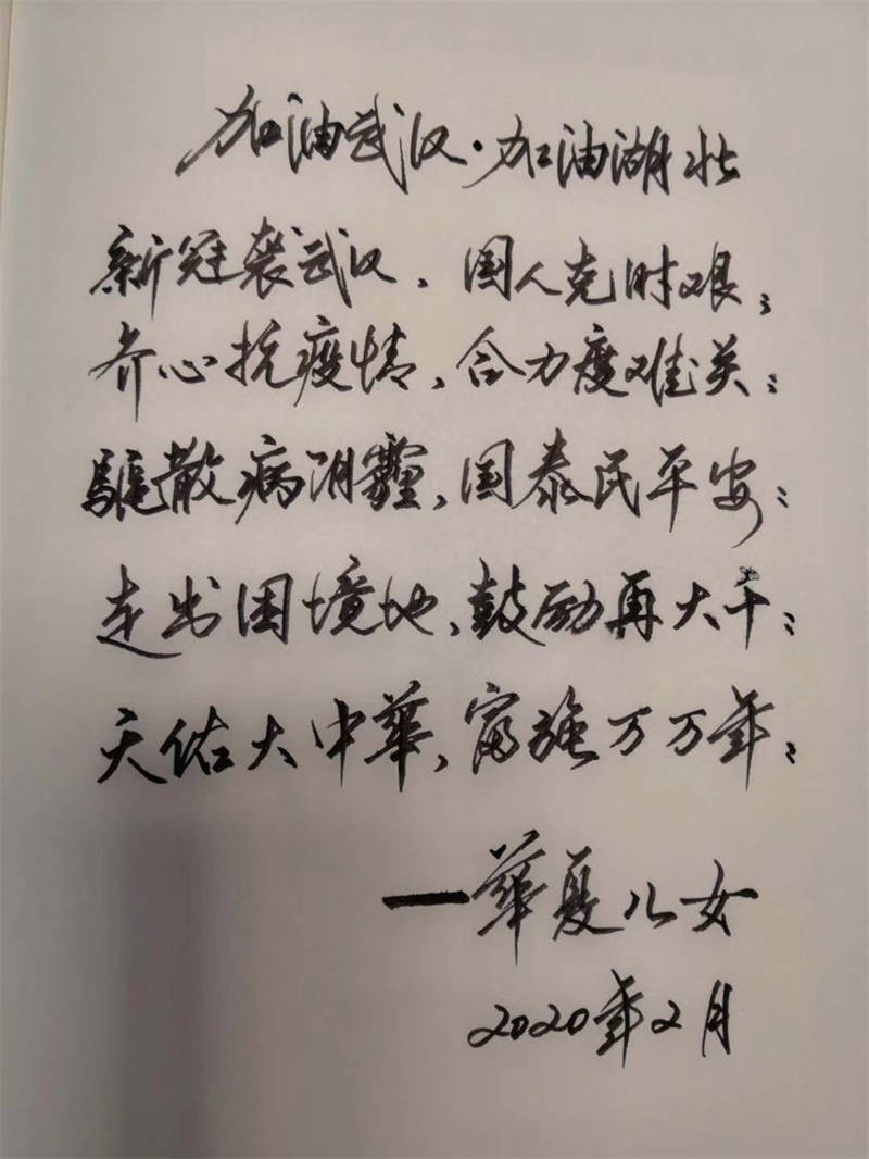 紙短情長述不盡心中敬意,以詩傳情道不盡心中謝意,詩詞歌賦雖不能驅散冠狀病毒,但能帶給人們百折不撓的勇氣和必勝的信心。以筆為槍能“齊心抗疫情,合力度難關”,以詩傳情能“驅散病陰霾,國泰民平安”,以筆墨應援能用筆觸的溫度,溫暖那些戰(zhàn)役中英雄。