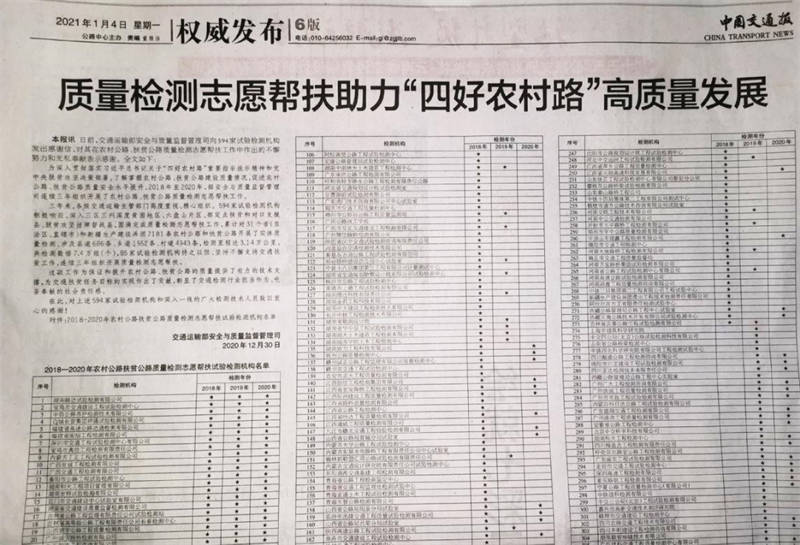 1月4日,中國交通報(bào)6版以《質(zhì)量檢測志愿幫扶助力“四好農(nóng)村路”高質(zhì)量發(fā)展》為題進(jìn)行報(bào)道。