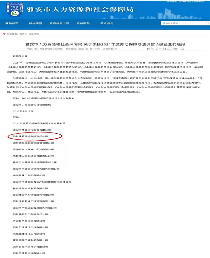 近日,根據(jù)《雅安市人力資源和社會保障局關(guān)于表揚2021年度勞動保障守法誠信 A級企業(yè)的通報》,雅安交通建設(shè)(集團)有限責任公司下屬四川康藏路橋有限責任公司榮獲2021年度勞動保障守法誠信 A級企業(yè),名列我市“誠信紅榜”。