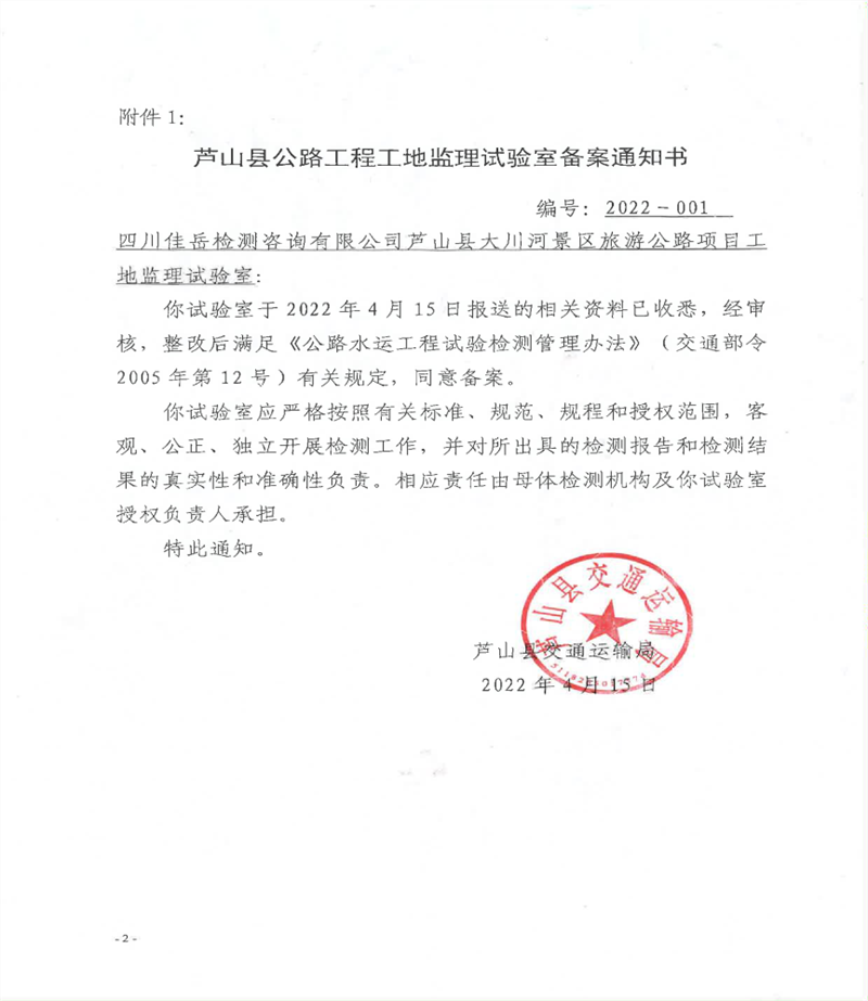 近日,交建集團四川佳岳檢測咨詢有限公司蘆山縣大川河景區(qū)旅游公路項目監(jiān)理試驗室,通過蘆山縣交通運輸局備案驗收,標志著佳岳公司蘆山監(jiān)理試驗室對蘆山縣大川河景區(qū)旅游公路項目可以獨立開展母體授權(quán)參數(shù)內(nèi)的檢測工作,出具相應的檢測報告。