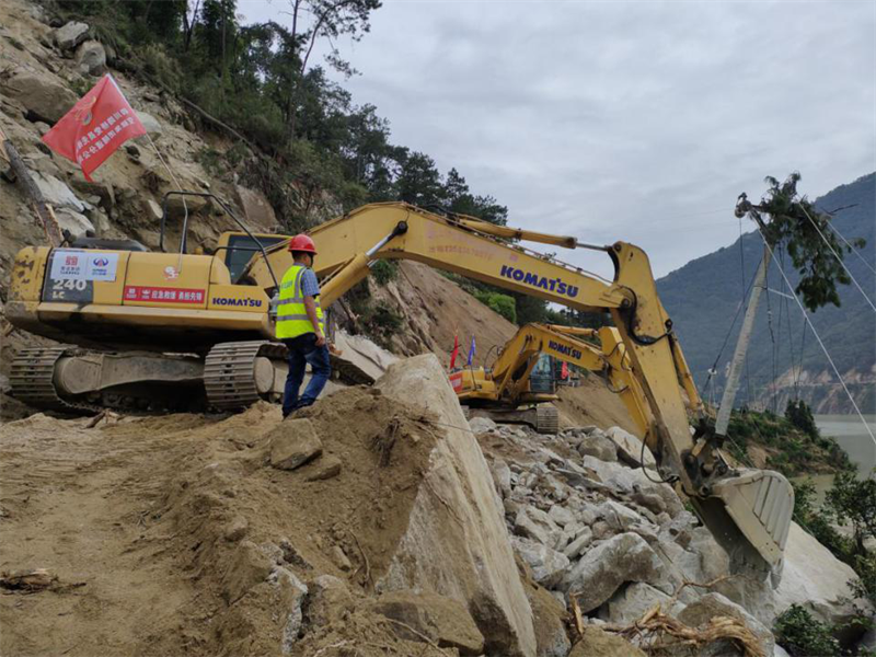 搶險(xiǎn)隊(duì)伍,馬上出發(fā)!集團(tuán)領(lǐng)導(dǎo)班子立即召開(kāi)碰頭會(huì),分析研判形勢(shì),安排部署工作,密切關(guān)注震區(qū)態(tài)勢(shì),成立抗震救災(zāi)領(lǐng)導(dǎo)小組,副總經(jīng)理鐘焱宇率現(xiàn)場(chǎng)指揮組趕赴石棉靠前指揮搶險(xiǎn)救災(zāi)。正在石棉G108線施工的康藏路橋公司項(xiàng)目部組成10人搶險(xiǎn)救援小分隊(duì),攜帶挖掘機(jī)4臺(tái)、拖車4臺(tái)、裝載機(jī)3臺(tái)、交通運(yùn)輸車2輛、無(wú)人機(jī)1臺(tái),第一時(shí)間到就地?fù)岆U(xiǎn)工作,震后7小時(shí),完成國(guó)道G108線馬富至菩薩崗約40公里路段、6處塌方點(diǎn)1600余方土石方清理,爾后轉(zhuǎn)戰(zhàn)石棉縣新民鄉(xiāng)進(jìn)行通鄉(xiāng)道路搶通作業(yè)。