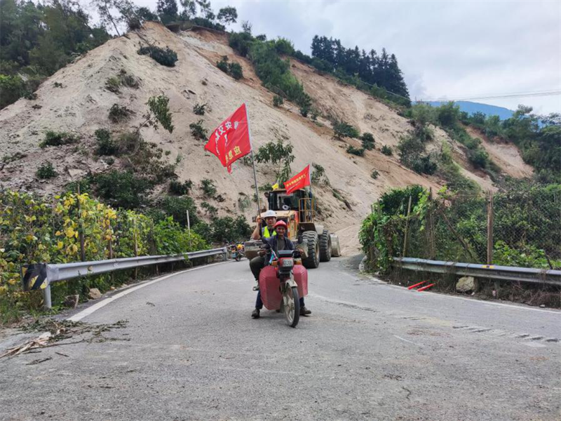 9月5日,項目經理吳學林同志帶領突擊隊率先抵達G108線菩薩崗。一次次余震攔不住他們的腳步,一聲聲哀嚎更堅定了他們逆行的決心。在通訊受阻的情況下,緊急調配2臺挖掘機、1臺推土機自G108線又轉戰(zhàn)新民鄉(xiāng),在受災嚴重的X067縣道開展道路搶通以及救援工作。在搶險一線,飛石及塌方的風險時刻危及著救災人員的自身安全。“一定要多觀察!首先要保證自己的安全才能更好地完成搶險工作!”項目經理吳學林同志、項目工程部副部長李健同志在轟鳴的搶險現場喊破嗓子指揮著各類機具搶險作業(yè)。待通訊恢復后,吳學林同志一邊組織現場搶險,一邊實時逐級上報受災和搶險情況,與第一時間趕來的集團公司和路橋公司現場指揮組,會商道路受阻情況,研究布置搶險保通工作。緊接著,石棉項目部搶險人員來不及片刻休息,馬不停蹄地投入到一處處塌方、受阻道路搶通中。