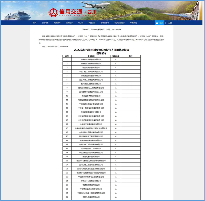 近日,四川省交通運(yùn)輸廳“信用交通(四川)”公示2022年擬投資四川省高速公路投資人信用狀況復(fù)核結(jié)果和2022年第3批擬投資四川省高速公路投資人初次信用評(píng)價(jià)結(jié)果,雅安市交通建設(shè)(集團(tuán))有限責(zé)任公司及下屬全資子公司四川康藏路橋有限責(zé)任公司獲得“A”級(jí)信用評(píng)價(jià)。
