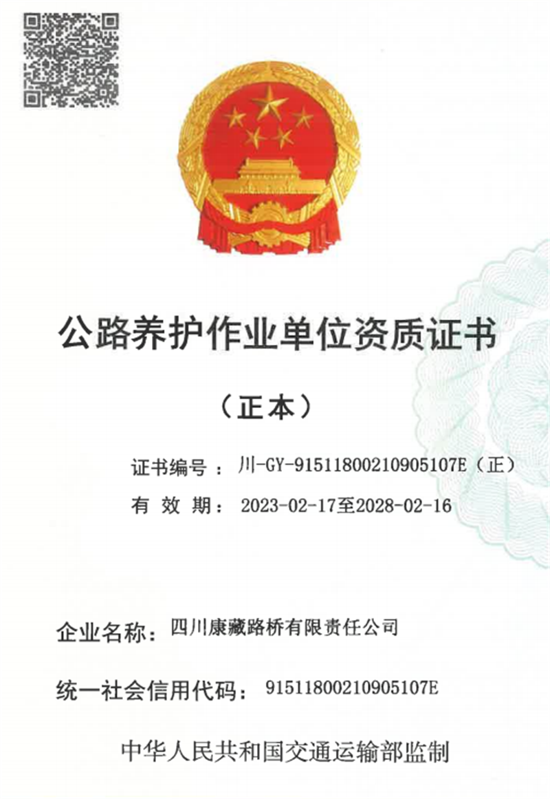 四川康藏路橋有限責(zé)任公司取得路基路面養(yǎng)護(hù)乙級(jí)資質(zhì)