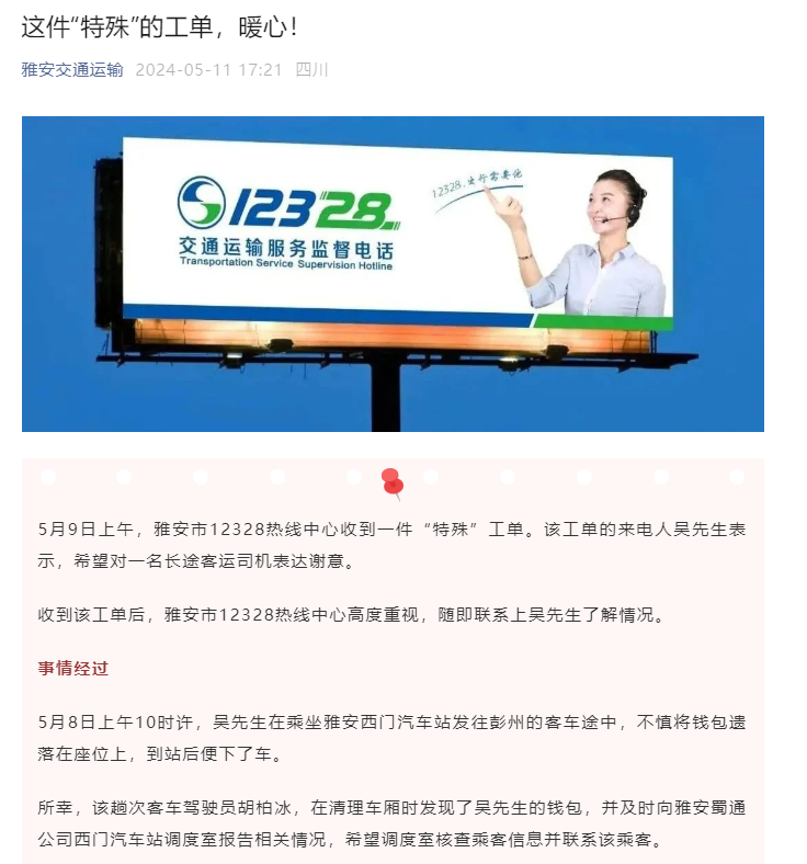 5月8日上午,乘客吳先生在乘坐蜀通公司客車時(shí),不慎將錢包遺落在座位上。司機(jī)胡柏冰在清理車廂衛(wèi)生時(shí)發(fā)現(xiàn)了這個(gè)錢包,他立即向蜀通公司西門車站調(diào)度室匯報(bào),并在調(diào)度室的協(xié)助下,吳先生成功取回了自己的錢包。雅安市12328熱線中心在接到吳先生的反饋后,對蜀通公司的服務(wù)和司機(jī)胡柏冰的善舉給予了高度評價(jià),并通過雅安交通局公眾號進(jìn)行了宣傳表揚(yáng)。