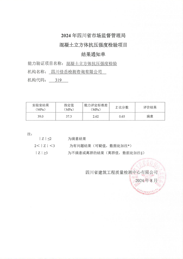 喜訊!四川佳岳檢測(cè)咨詢有限公司(簡(jiǎn)稱:佳岳公司)在2024年度四川省市場(chǎng)監(jiān)督管理局組織的檢驗(yàn)檢測(cè)機(jī)構(gòu)能力驗(yàn)證項(xiàng)目中,參與的“混凝土立方體抗壓強(qiáng)度檢驗(yàn)”項(xiàng)目獲得“滿意”評(píng)價(jià)。