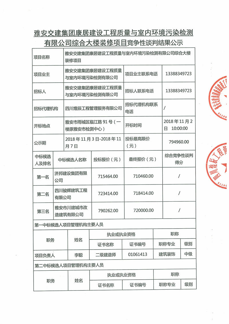 雅安交建集團(tuán)康居建設(shè)工程質(zhì)量與室內(nèi)環(huán)境污染檢測(cè)有限公司綜合大樓裝修項(xiàng)目競(jìng)爭(zhēng)性談判結(jié)果公示
