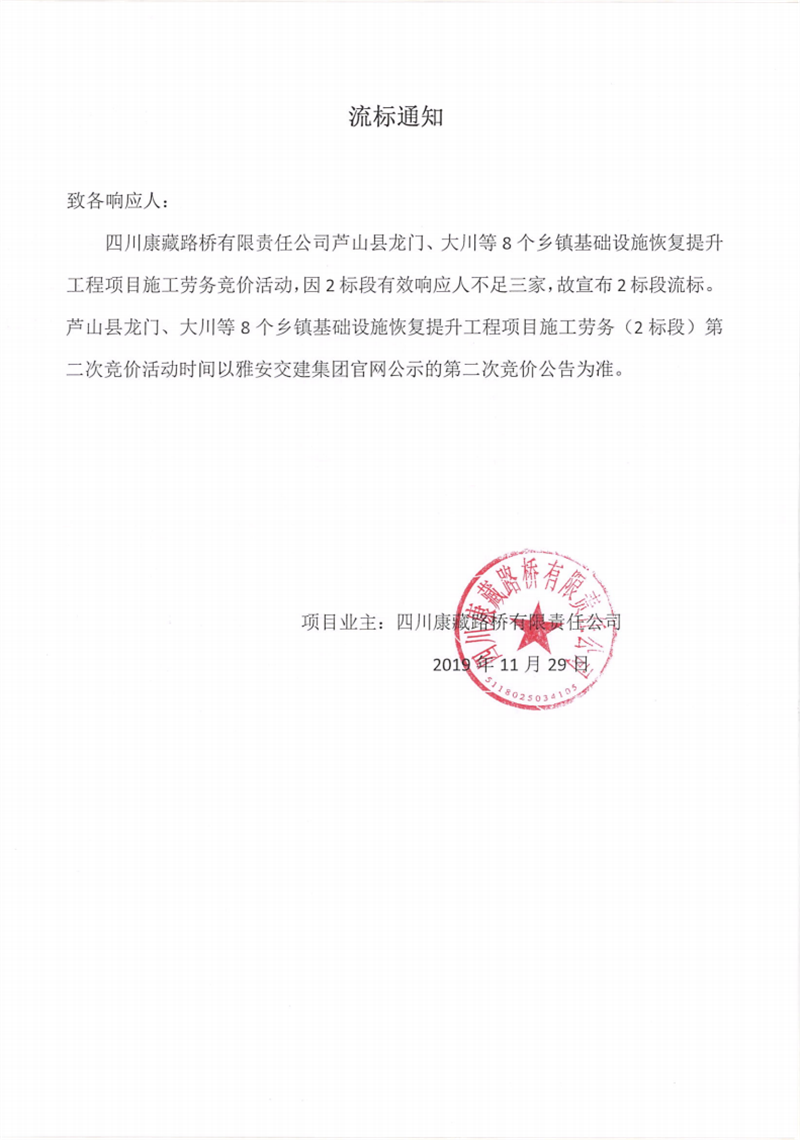四川康藏路橋有限責任公司蘆山縣龍門、大川等8個鄉(xiāng)鎮(zhèn)基礎(chǔ)設(shè)施恢復(fù)提升工程項目施工勞務(wù)(2標段)競價流標通知
