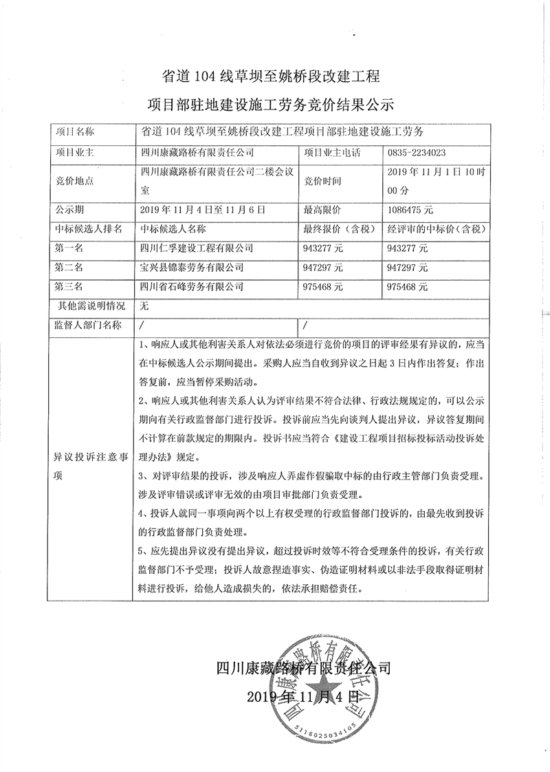 四川康藏路橋有限責任公司省道104線草壩至姚橋段改建工程項目部駐地建設(shè)施工勞務(wù)競價結(jié)果公示