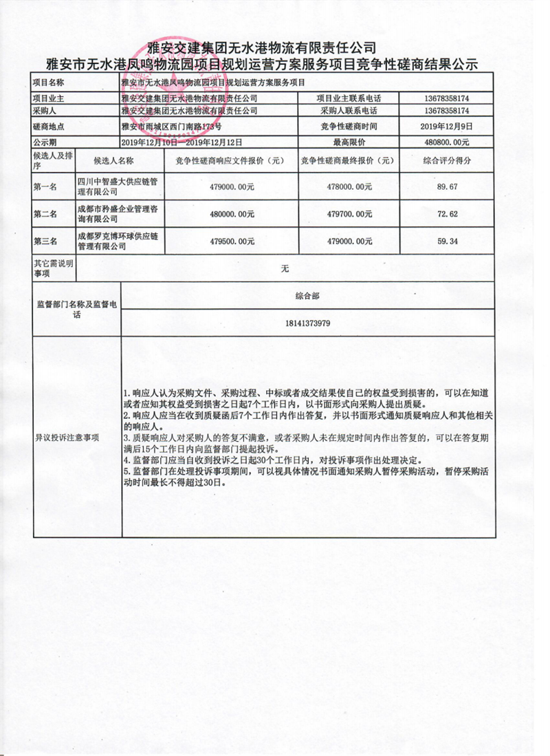 雅安交建集團(tuán)無水港物流有限責(zé)任公司雅安市無水港鳳鳴物流園項(xiàng)目規(guī)劃運(yùn)營方案服務(wù)項(xiàng)目競爭性磋商結(jié)果公示