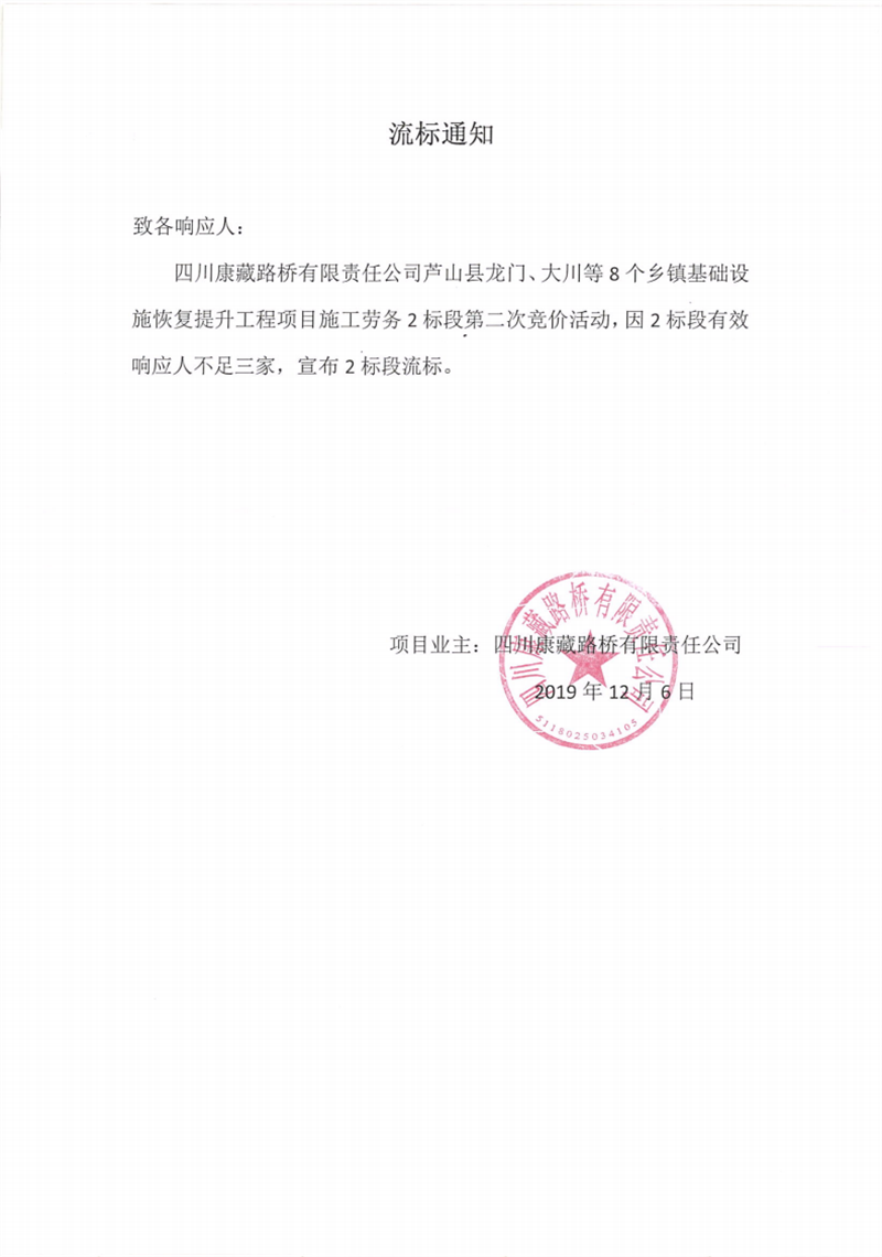 四川康藏路橋有限責(zé)任公司蘆山縣龍門、大川等8個鄉(xiāng)鎮(zhèn)基礎(chǔ)設(shè)施恢復(fù)提升工程項目施工勞務(wù)2標(biāo)段第二次競價流標(biāo)通知