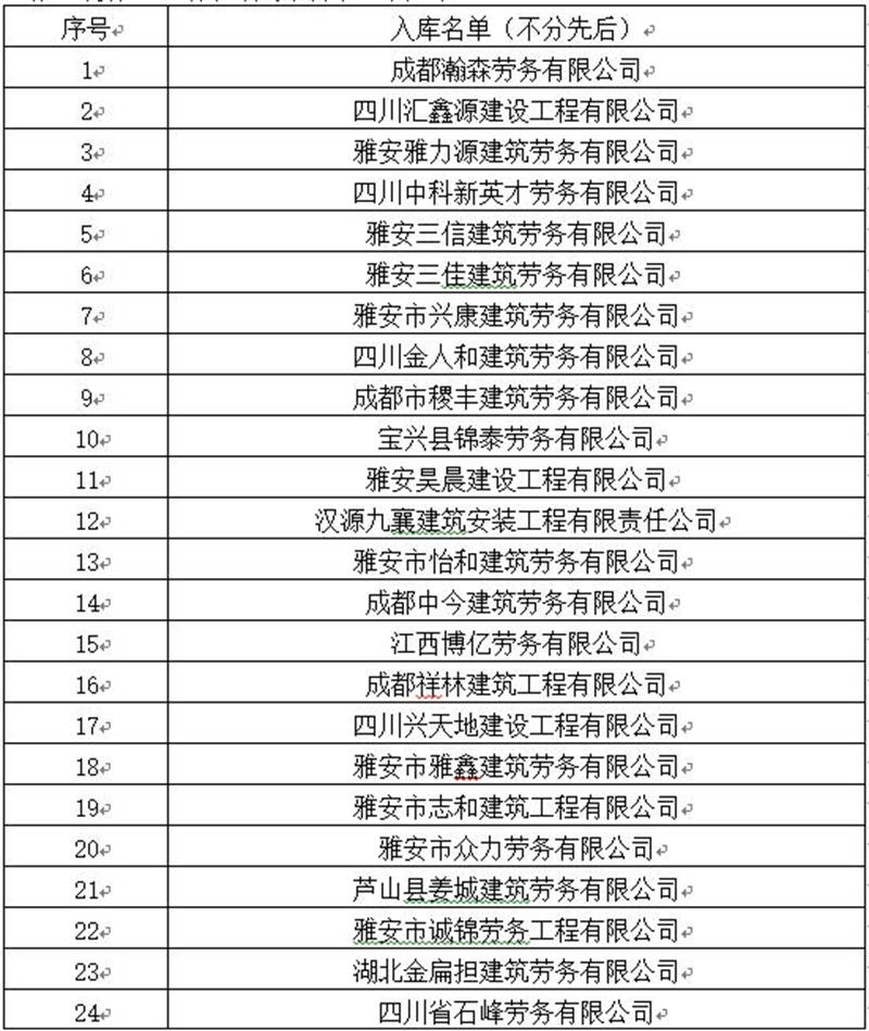 雅安交建集團(tuán)路橋有限責(zé)任公司勞務(wù)服務(wù)入庫比選項目于2019年5月11日完成開評標(biāo)工作,現(xiàn)將比選結(jié)果即入庫名單公示如下: