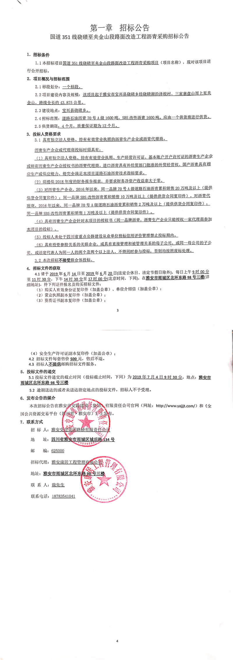 雅安交建集團(tuán)路橋有限責(zé)任公司國道351線磽磧至夾金山段路面改造工程瀝青采購招標(biāo)公告