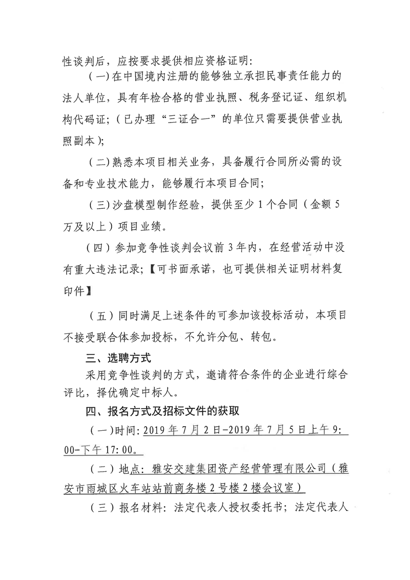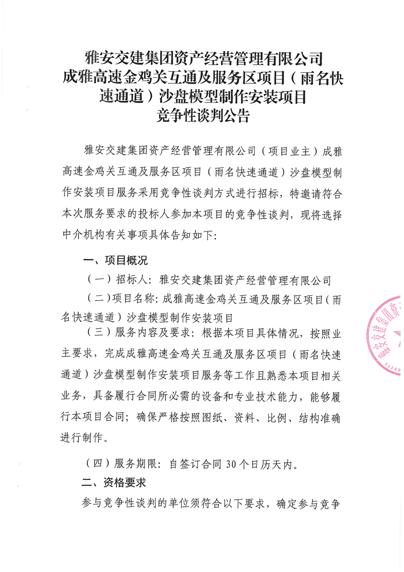 雅安交建集團資產(chǎn)經(jīng)營管理有限公司成雅高速金雞關(guān)互通及服務區(qū)項目(雨名快速通道)沙盤模型制作安裝項目競爭性談判公告