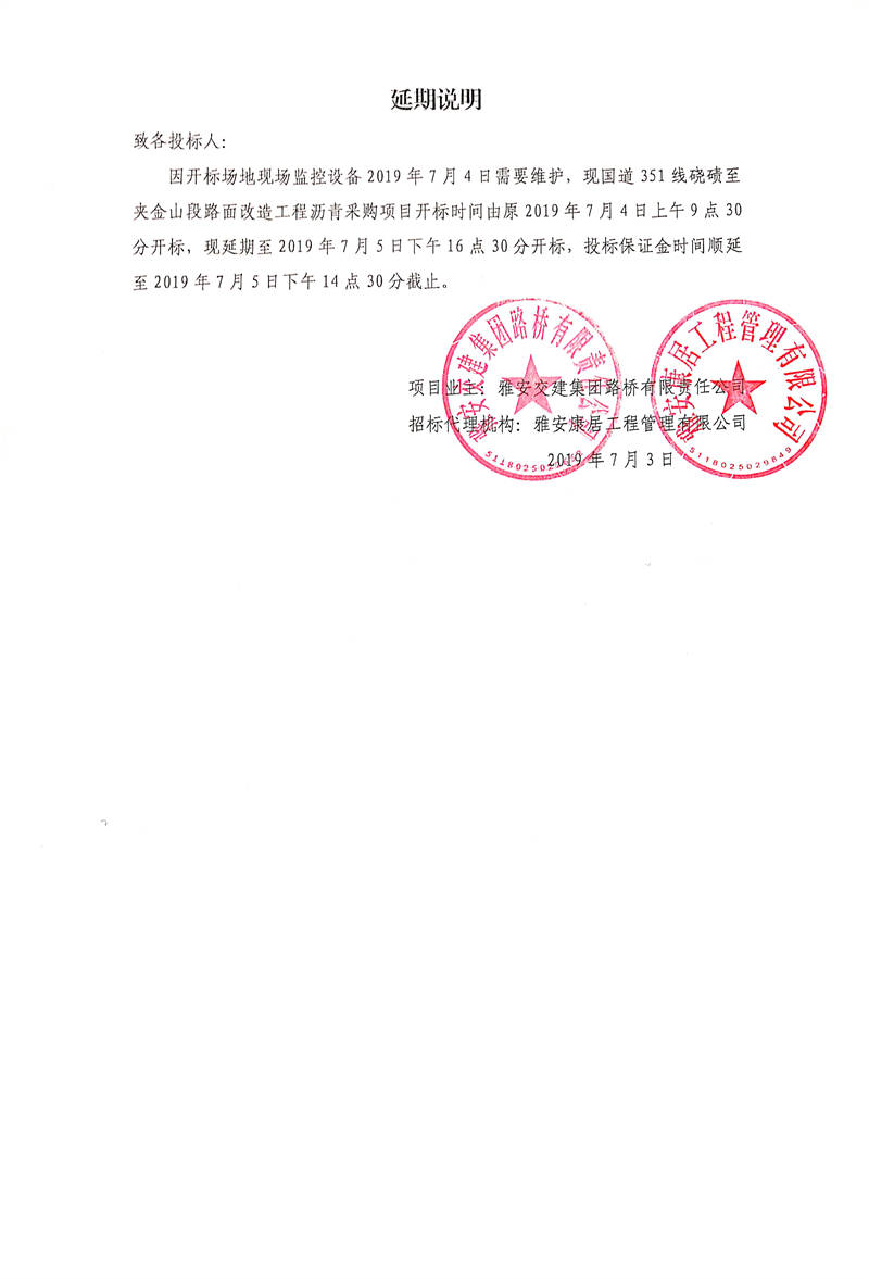 雅安交建集團(tuán)路橋有限責(zé)任公司國(guó)道351線磽磧至夾金山段路面改造工程瀝青采購(gòu)招標(biāo)延期說明