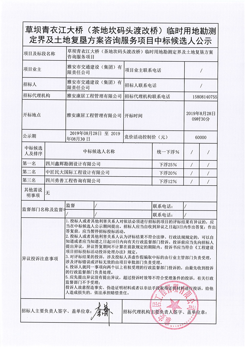 雅安市交通建設(集團)有限責任公司草壩青衣江大橋(茶地坎碼頭渡改橋)臨時用地勘測定界及土地復墾方案咨詢服務項目競價結果公示