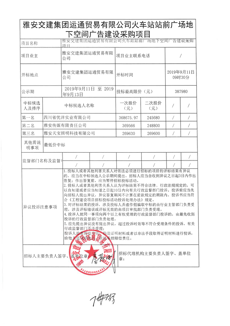 雅安交建集團(tuán)運(yùn)通貿(mào)易有限公司火車站站前廣場(chǎng)地下空間廣告建設(shè)采購(gòu)項(xiàng)目結(jié)果公示