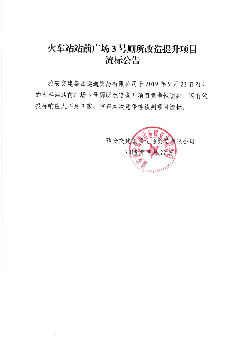 雅安交建集團(tuán)運(yùn)通貿(mào)易有限公司火車(chē)站站前廣場(chǎng)3號(hào)廁所改造提升項(xiàng)目流標(biāo)公告