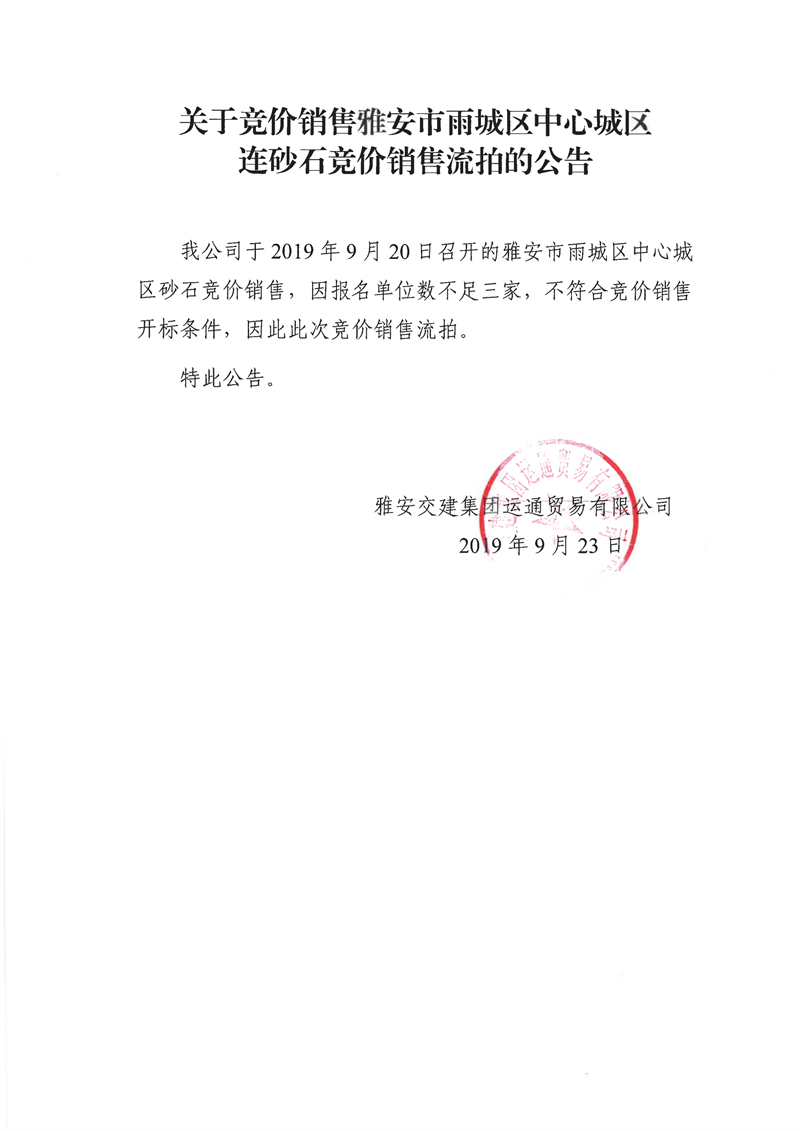 雅安交建集團運通貿(mào)易有限公司關(guān)于競價銷售雅安市雨城區(qū)中心城區(qū)連砂石競價銷售流拍的公告