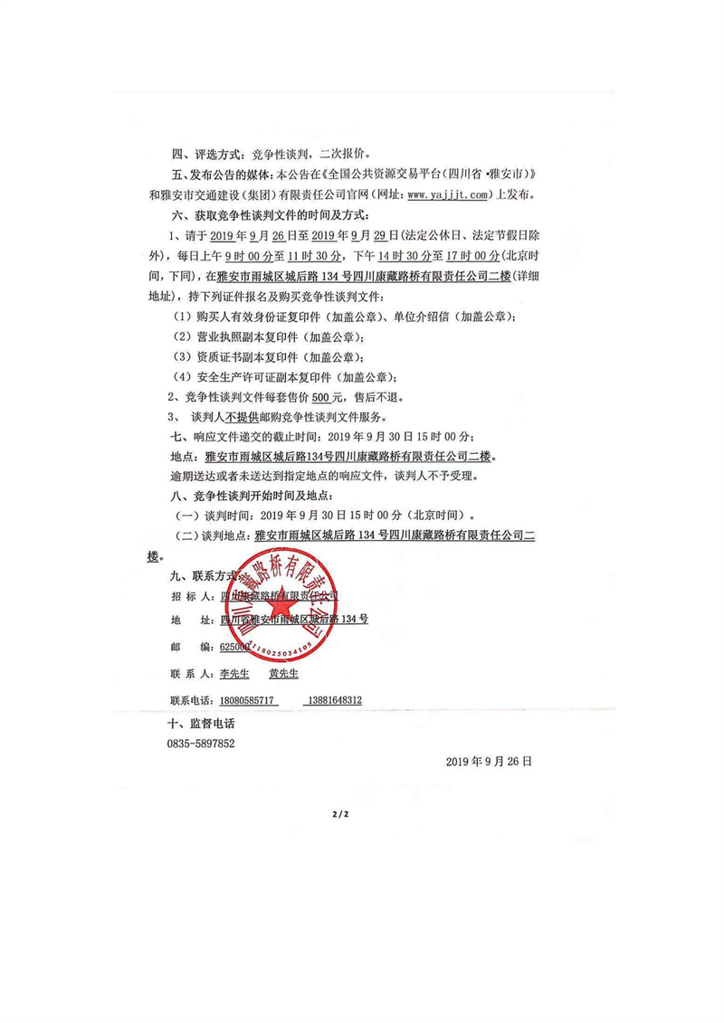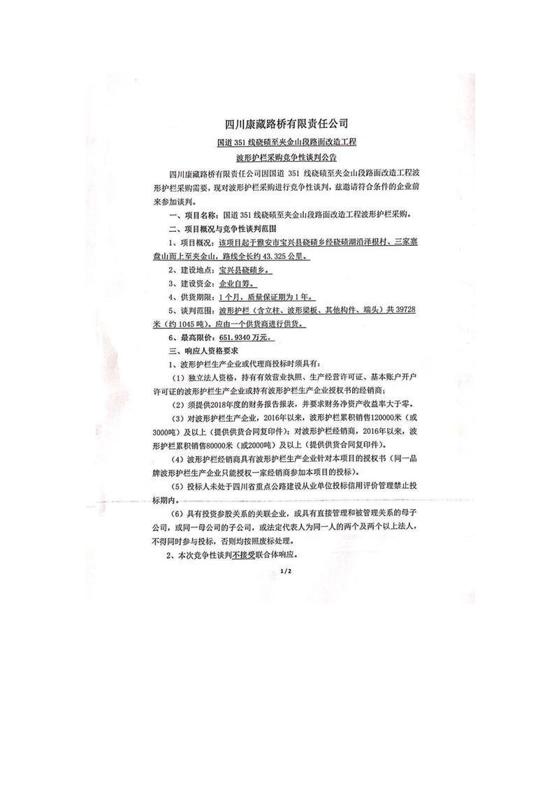 四川康藏路橋有限責(zé)任公司國(guó)道351線磽磧至夾金山段路面改造工程波形護(hù)欄采購競(jìng)爭(zhēng)性談判公告
