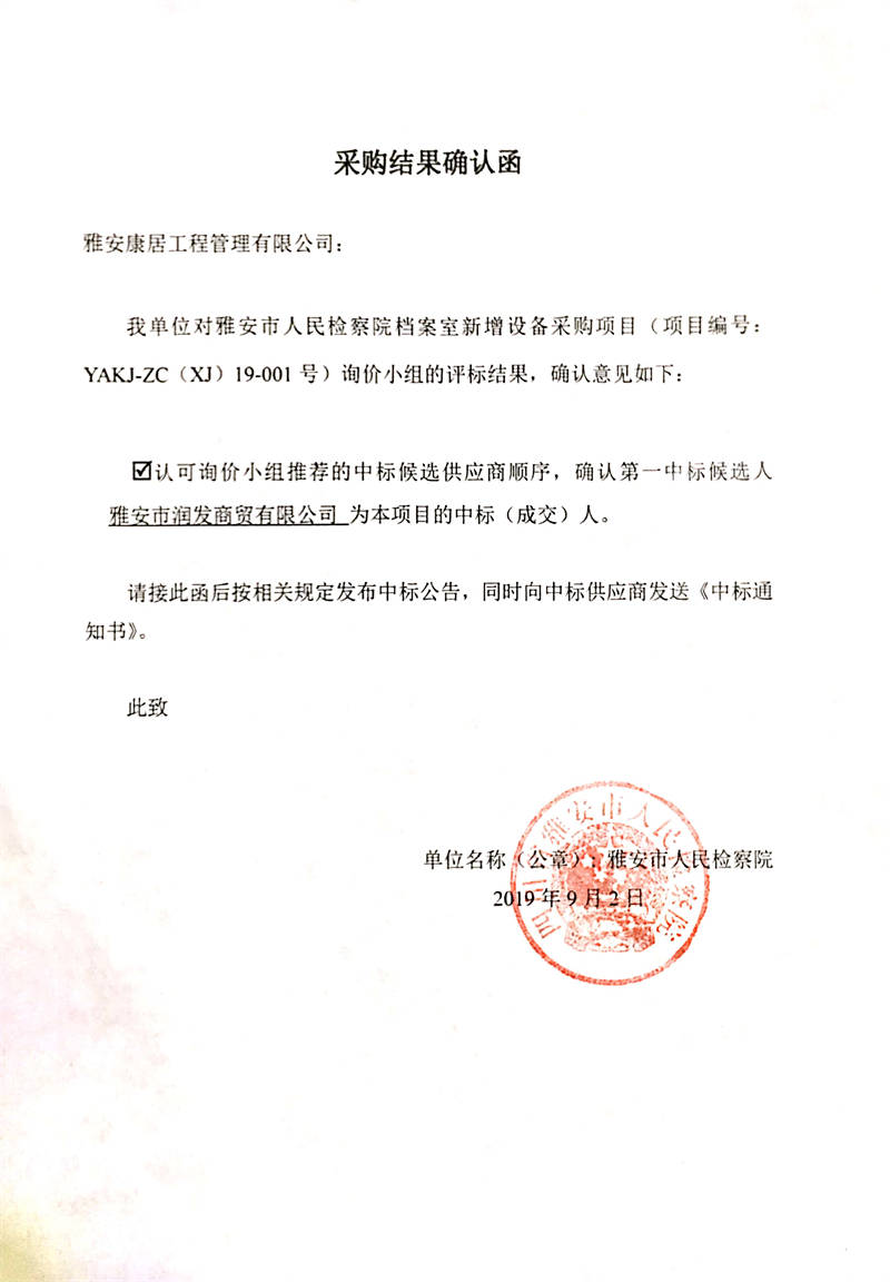 雅安市人民檢察院檔案室新增設(shè)備采購項(xiàng)目結(jié)果公示