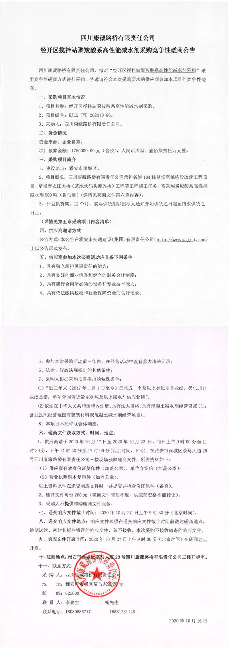 四川康藏路橋有限責任公司經(jīng)開區(qū)攪拌站聚羧酸系高性能減水劑采購競爭性磋商公告