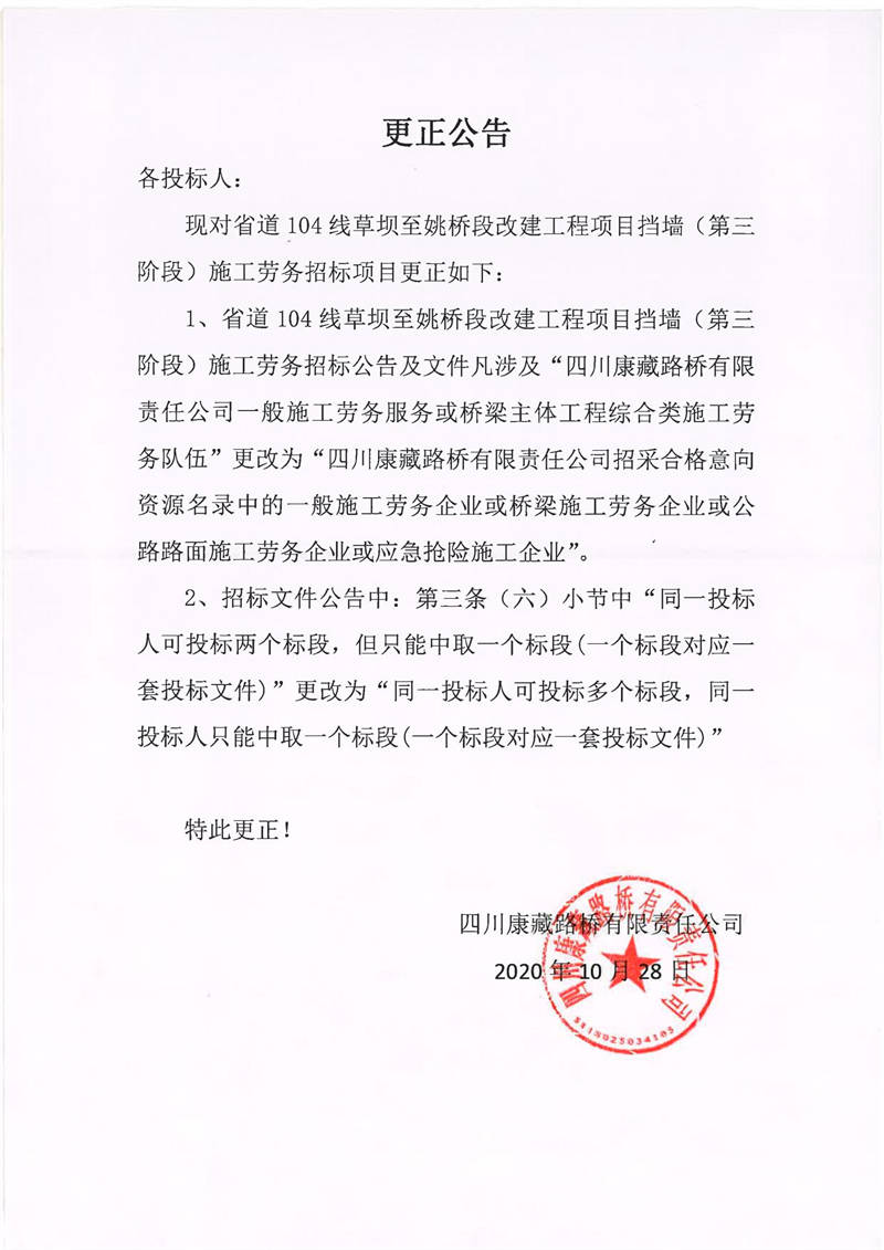 四川康藏路橋有限責(zé)任公司省道104線草壩至姚橋段改建工程項(xiàng)目擋墻(第三階段)施工勞務(wù)招標(biāo)項(xiàng)目更正公告