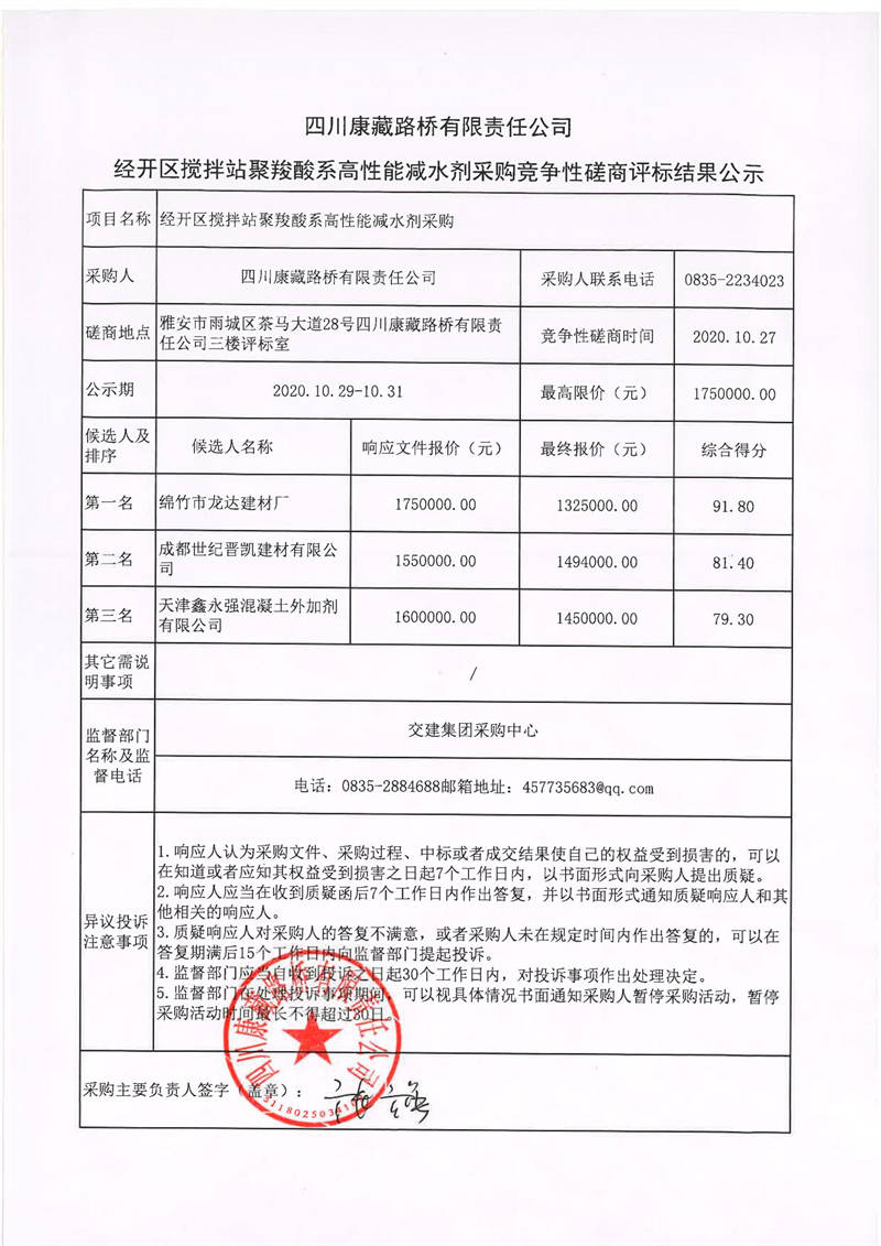 四川康藏路橋有限責(zé)任公司經(jīng)開區(qū)攪攔站聚羧酸系高性能減水劑采購(gòu)競(jìng)爭(zhēng)性磋商評(píng)標(biāo)結(jié)果公示