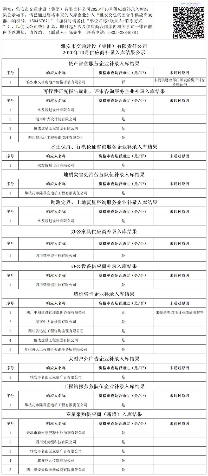 雅安市交通建設(shè)(集團(tuán))有限責(zé)任公司2020年10月供應(yīng)商補(bǔ)錄入庫(kù)結(jié)果公示