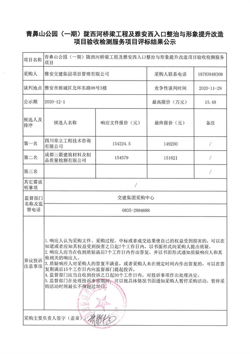 雅安交建集團(tuán)項(xiàng)目管理有限公司青鼻山公園(一期)隴西河橋梁工程及雅安西入口整治與形象提升改造項(xiàng)目驗(yàn)收檢測服務(wù)項(xiàng)目評(píng)標(biāo)結(jié)果公示
