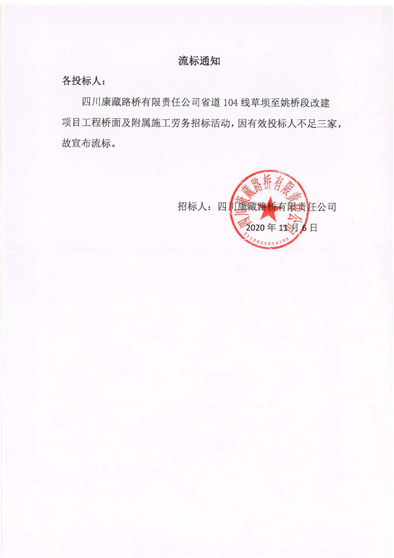 四川康藏路橋有限責(zé)任公司省道104線(xiàn)草壩至姚橋段改建項(xiàng)目工程橋面及附屬施工勞務(wù)流標(biāo)通知