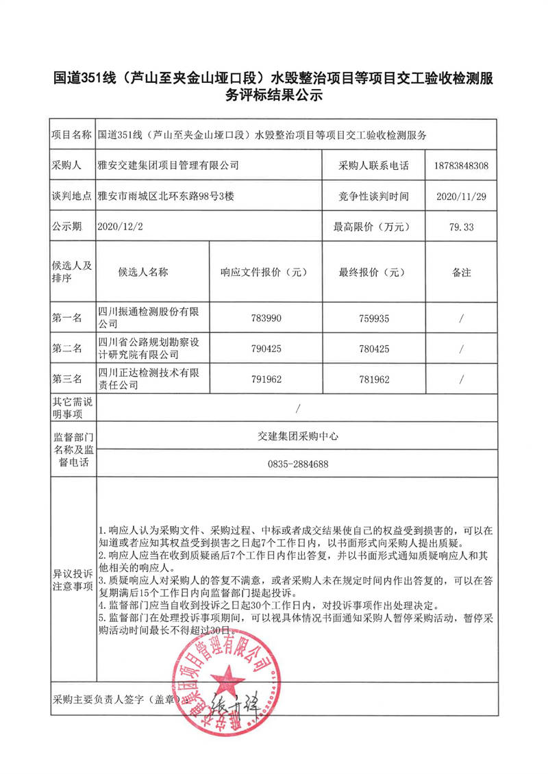 雅安交建集團項目管理有限公司國道351線(蘆山至夾金山埡口段)水毀整治項目等項目交工驗收檢測服務(wù)評標結(jié)果公示