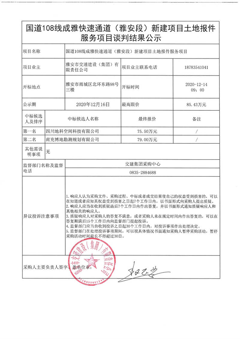 雅安市交通建設(shè)(集團)有限責任公司國道108線成雅快速通道(雅安段)新建項目土地報件服務項目談判結(jié)果公示