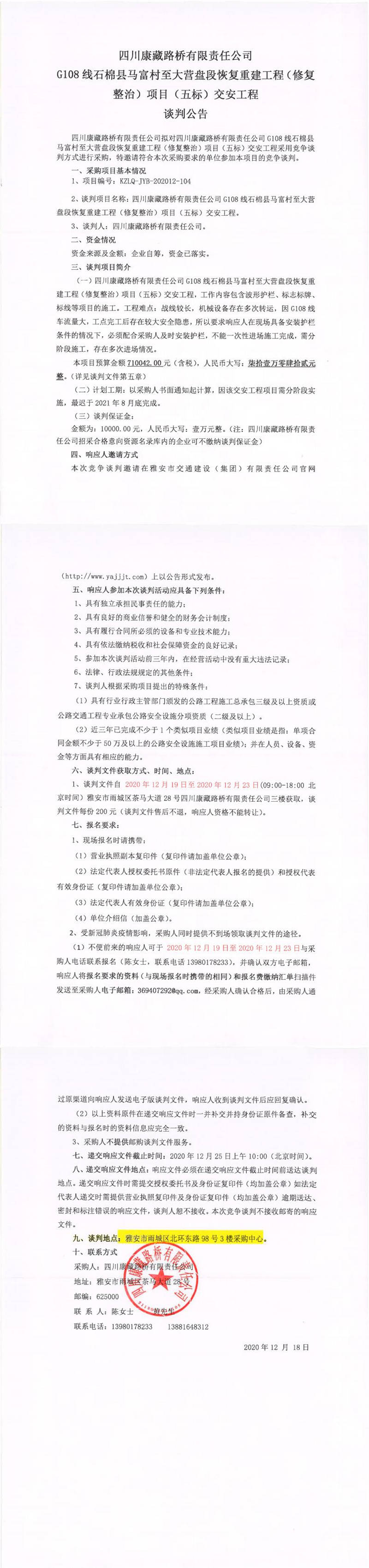 四川康藏路橋有限責(zé)任公司G108線石棉縣馬富村至大營(yíng)盤段恢復(fù)重建工程(修復(fù)整治)項(xiàng)目(五標(biāo))交安工程談判公告