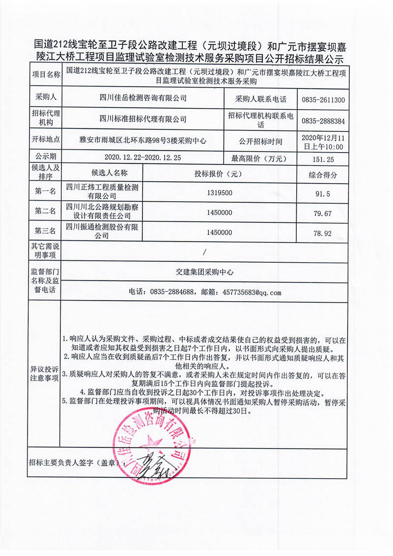 四川佳岳檢測(cè)咨詢有限公司國(guó)道212線寶輪至衛(wèi)子段公路改建工程(元壩過境段)和廣元市擺宴壩嘉陵江大橋工程項(xiàng)目監(jiān)理試驗(yàn)室檢測(cè)技術(shù)服務(wù)采購項(xiàng)目公開招標(biāo)結(jié)果公示