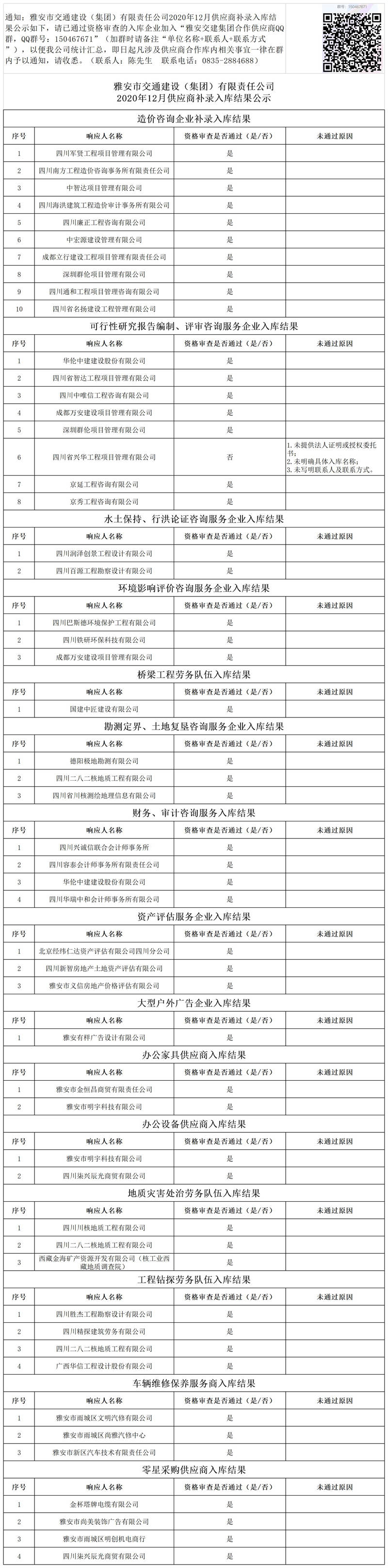 雅安市交通建設(shè)(集團)有限責(zé)任公司2020年12月供應(yīng)商補錄入庫結(jié)果公示