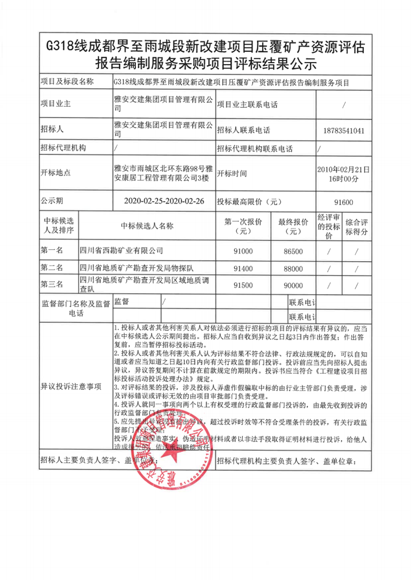 雅安交建集團項目管理有限公司G318線成都界至雨城段新改建項目壓覆礦產(chǎn)資源評估報告編制服務采購項目評標結果公示