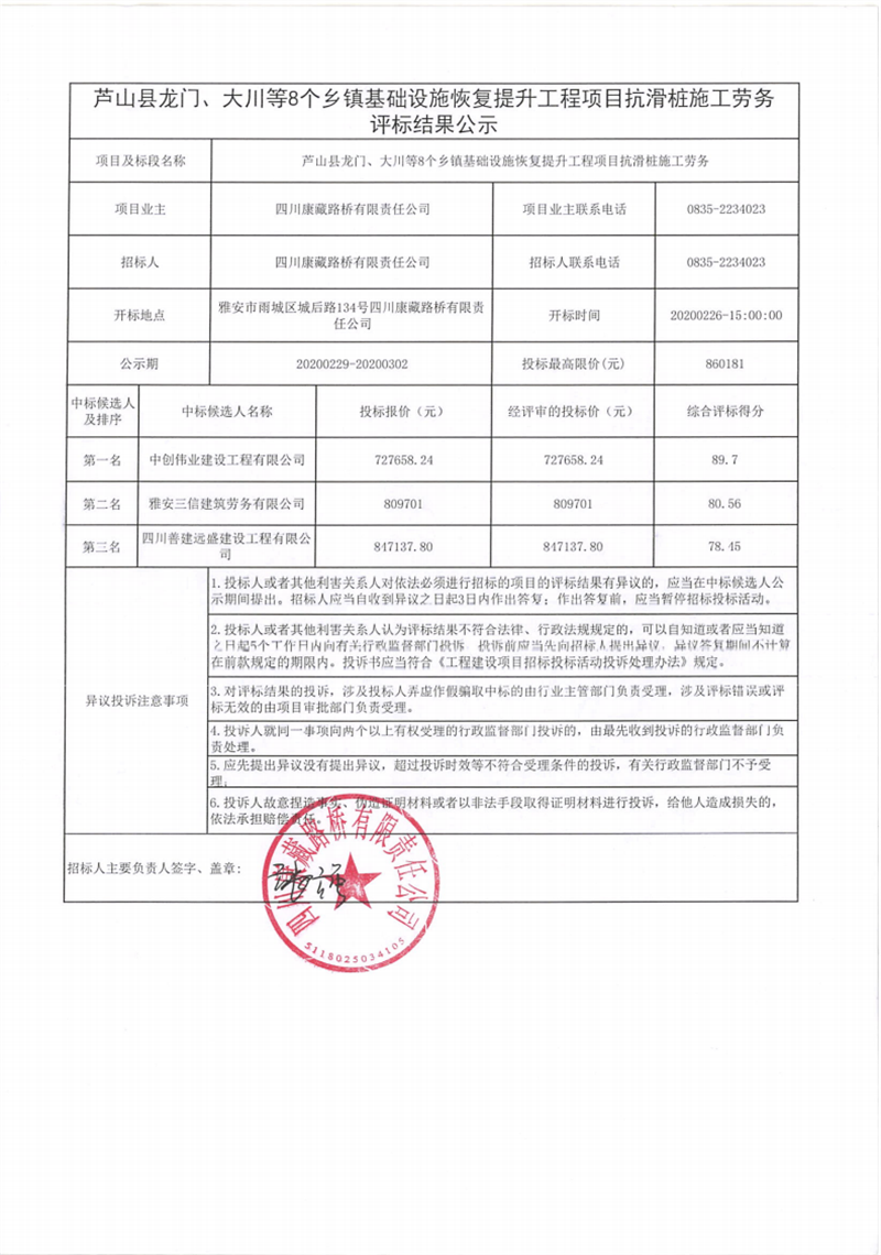 四川康藏路橋有限責(zé)任公司蘆山縣龍門(mén)、大川等8個(gè)鄉(xiāng)鎮(zhèn)基礎(chǔ)設(shè)施恢復(fù)提升工程項(xiàng)目抗滑樁施工勞務(wù)評(píng)標(biāo)結(jié)果公示