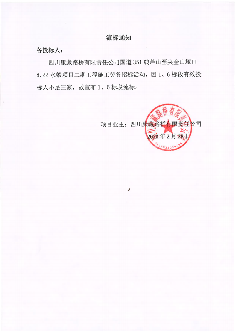 四川康藏路橋有限責任公司國道351線蘆山至夾金山埡口8.22水毀項目二期工程施工勞務(1標段、6標段)流標通知