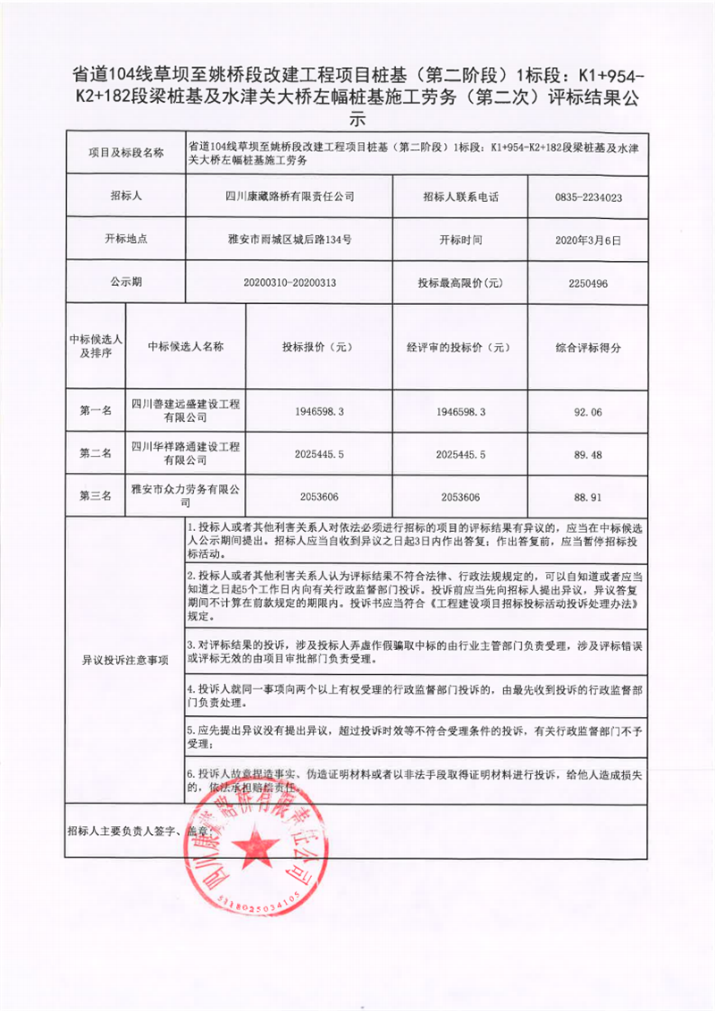 四川康藏路橋有限責任公司省道104線草壩至姚橋段改建工程項目樁基(第二階段)1標段:K1+954-K2+182段梁樁基及水津關(guān)大橋左幅樁基施工勞務(wù)(第二次)評標結(jié)果公示
