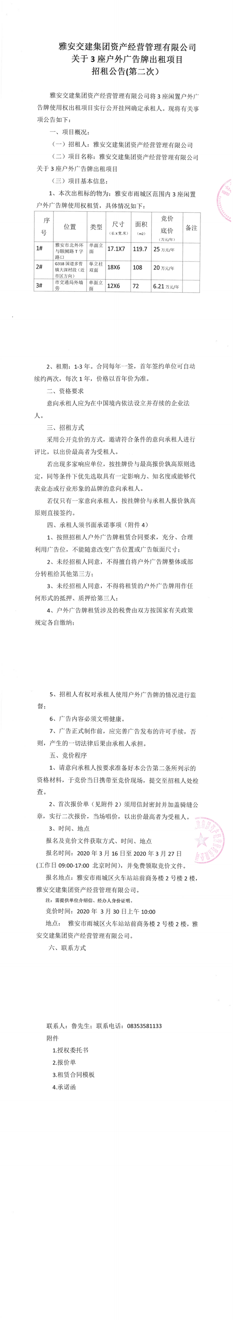 雅安交建集團資產(chǎn)經(jīng)營管理有限公司關于3座戶外廣告牌出租項目招租公告(第二次)