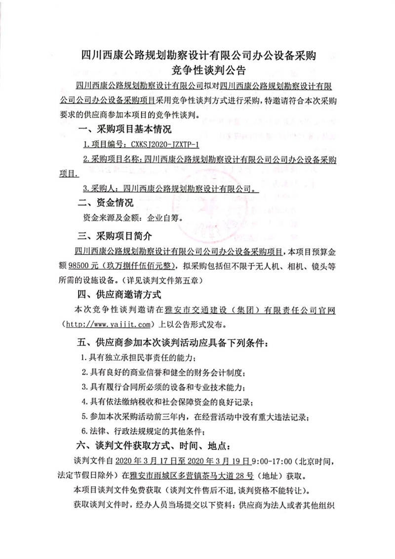 四川西康公路規(guī)劃勘察設(shè)計(jì)有限公司辦公設(shè)備采購競(jìng)爭(zhēng)性談判公告