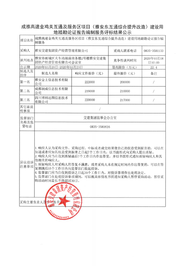 雅安交建集團資產(chǎn)經(jīng)營管理有限公司成雅高速金雞關(guān)互通及服務(wù)區(qū)項目(雅安東互通綜合提升改造)建設(shè)用地踏勘論證報告編制服務(wù)評標結(jié)果公示