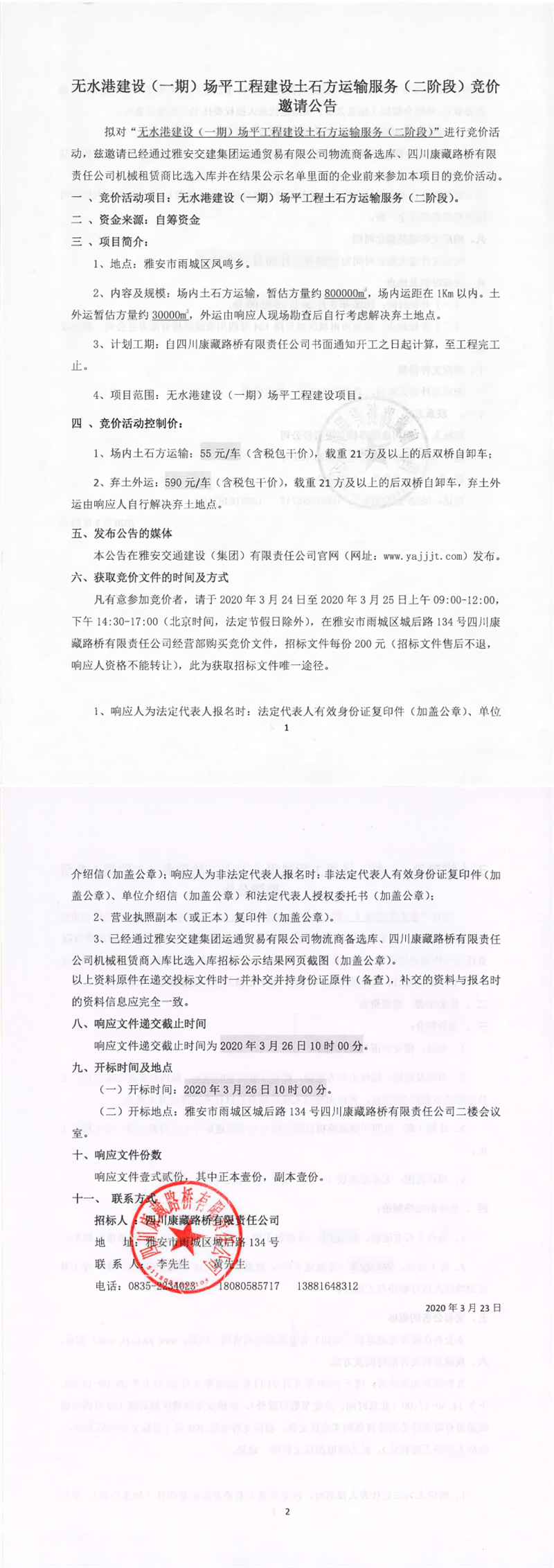 四川康藏路橋有限責(zé)任公司無水港建設(shè)(一期)場(chǎng)平工程建設(shè)土石方運(yùn)輸服務(wù)(二階段)競(jìng)價(jià)邀請(qǐng)公告