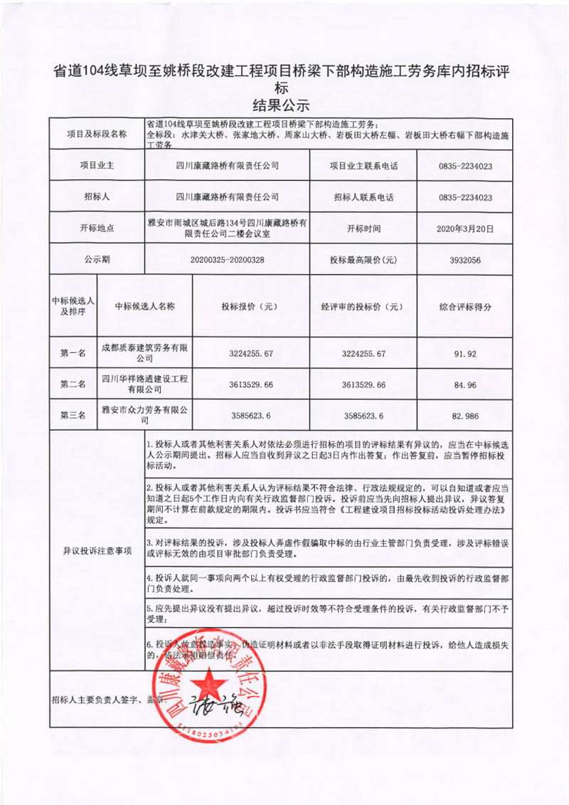 四川康藏路橋有限責(zé)任公司省道104線草壩至姚橋段改建工程項目橋梁下部構(gòu)造施工勞務(wù)評標結(jié)果公示