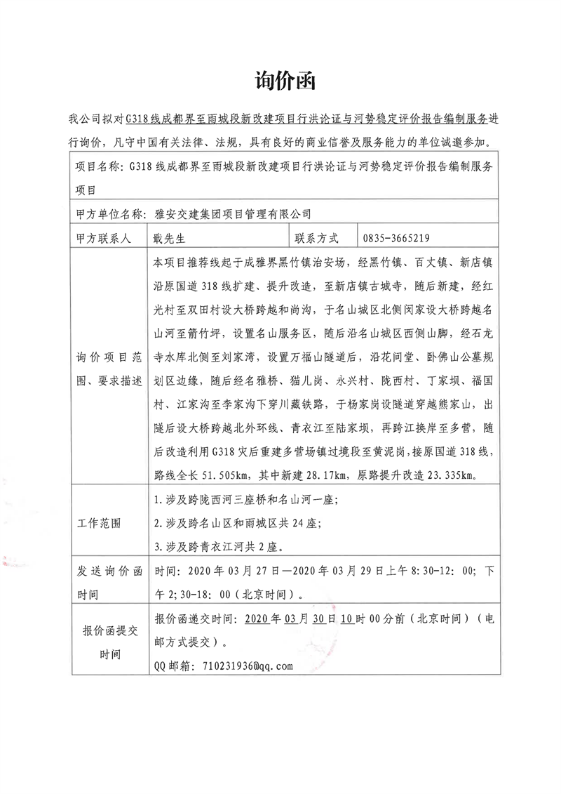 雅安交建集團(tuán)項(xiàng)目管理有限公司G318線成都界至雨城段新改建項(xiàng)目行洪論證與河勢穩(wěn)定評價報(bào)告編制服務(wù)項(xiàng)目詢價函
