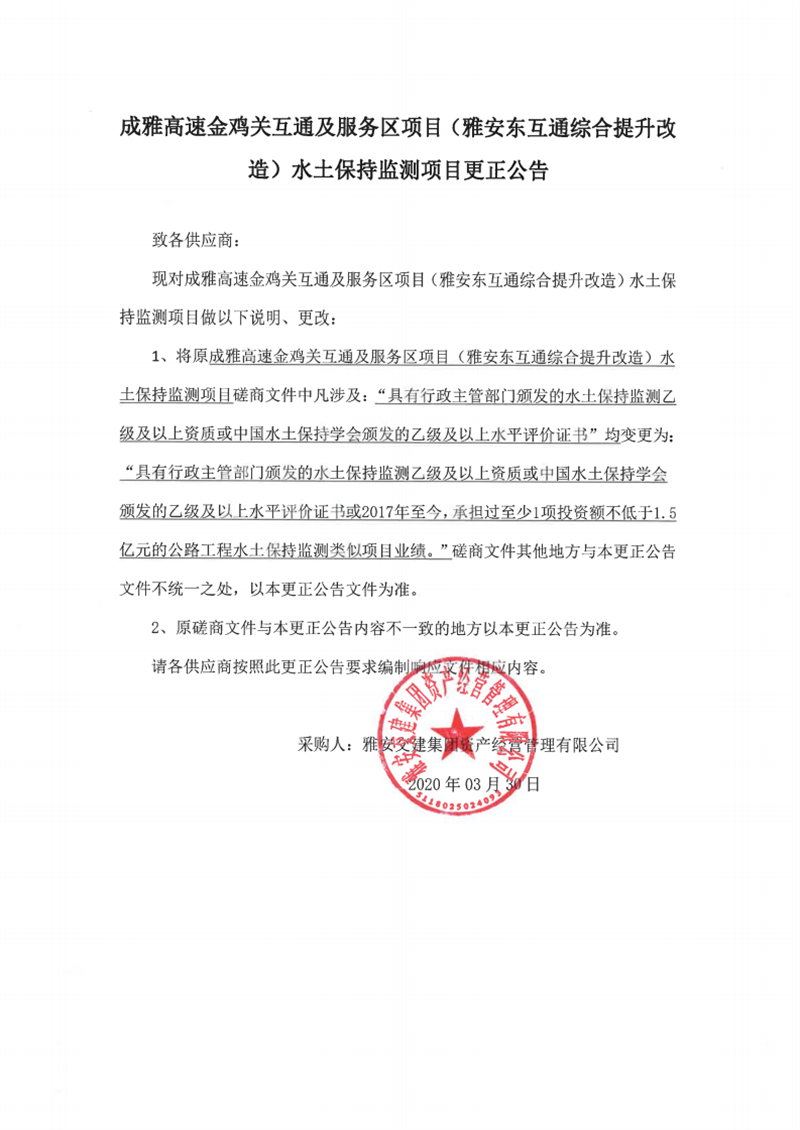 雅安交建集團資產(chǎn)經(jīng)營管理有限公司成雅高速金雞關互通及服務區(qū)項目(雅安東互通綜合提升改造)水土保持監(jiān)測項目更正公告
