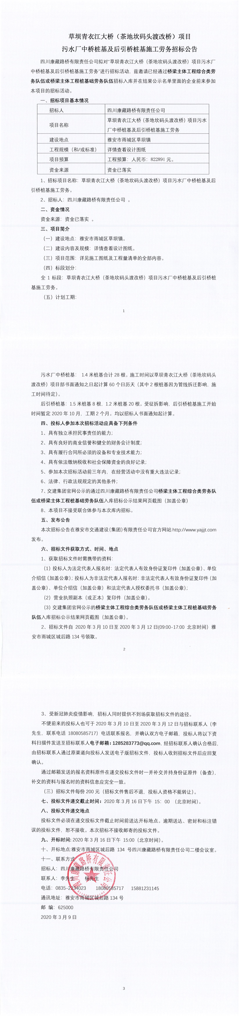 四川康藏路橋有限責(zé)任公司草壩青衣江大橋(茶地坎碼頭渡改橋)項目污水廠中橋樁基及后引橋樁基施工勞務(wù)招標公告