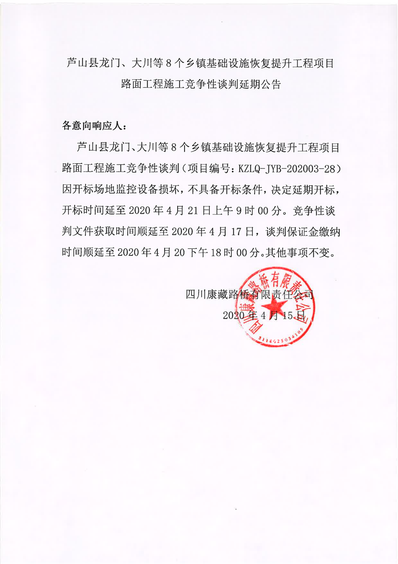 四川康藏路橋有限責(zé)任公司蘆山縣龍門(mén)、大川等8個(gè)鄉(xiāng)鎮(zhèn)基礎(chǔ)設(shè)施恢復(fù)提升工程項(xiàng)目路面工程施工競(jìng)爭(zhēng)性談判延期公告