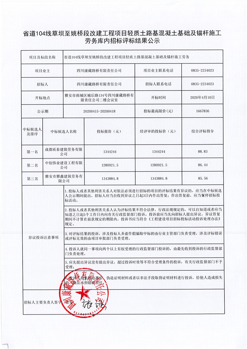 四川康藏路橋有限責(zé)任公司省道104線草壩至姚橋段改建工程項(xiàng)目輕質(zhì)土路基混凝土基礎(chǔ)及錨桿施工勞務(wù)庫內(nèi)招標(biāo)評(píng)標(biāo)結(jié)果公示